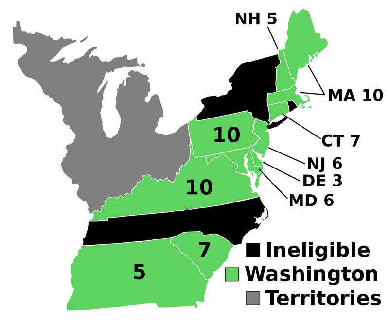 Ennek érdekében az Alkotmány létrehozott egy választási kollégiumot (az elektorokat) , ahol minden választó két szavazatot adhatott le két különböző jelöltre. Az egyes államok különböző módszerekkel választották meg az elektorokat, 5 államban az állami törvényhozás döntése nyomán, 6 államban pedig valamilyen választással.